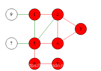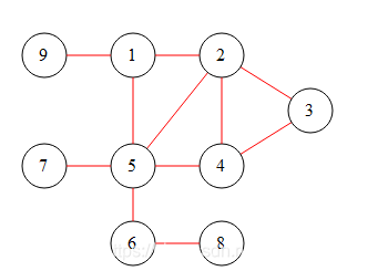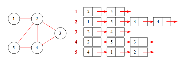 其左侧为图的示意图,右侧为图的邻接链表。红字表示节点序号,链表中为与这个节点相连的节点,如1节点与2、5节点相连。由于在go中,可以很方便地使用数组来代替链表,所以其链表结构可以写为