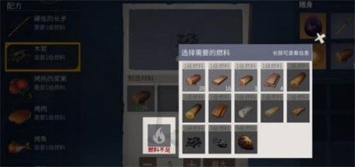 2、在烹饪架页面里大家可以看到很多制作物品,找到木炭将其打开可以看到所需的材料;